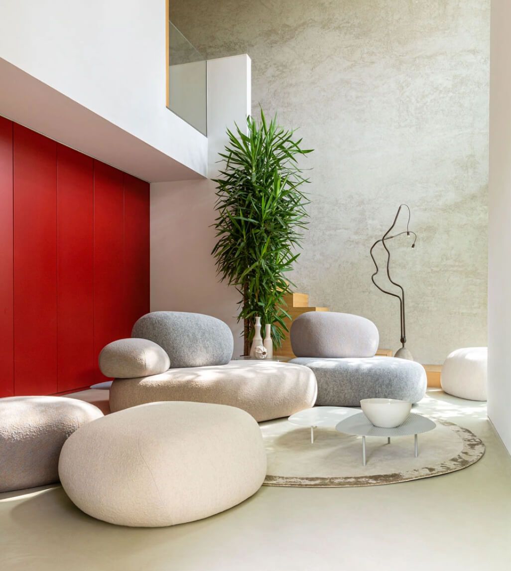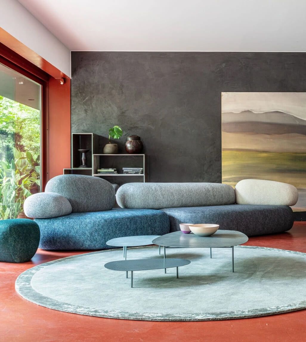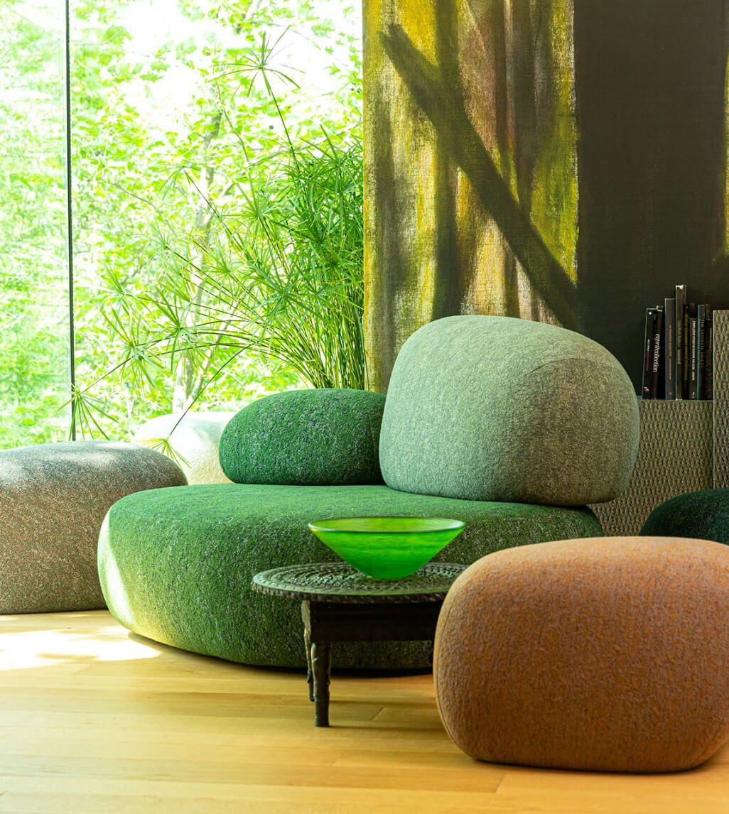 Благодаря модульной структуре, модульный диван Pebble Rubble предлагает безграничные возможности компоновки. 15 многофункциональных элементов и 3 пуфа позволяют создавать как уединенные уголки, так и масштабные композиции для общественных пространств — отелей, лобби, офисов. Диван Moroso этой коллекции не просто функционален — он рассказывает историю, соединяя природу и современный дизайн. Натуральные текстуры обивки, имитирующие мох или песчаник, усиливают эффект погружения в природную среду, даря ощущение гармонии и полного релакса.