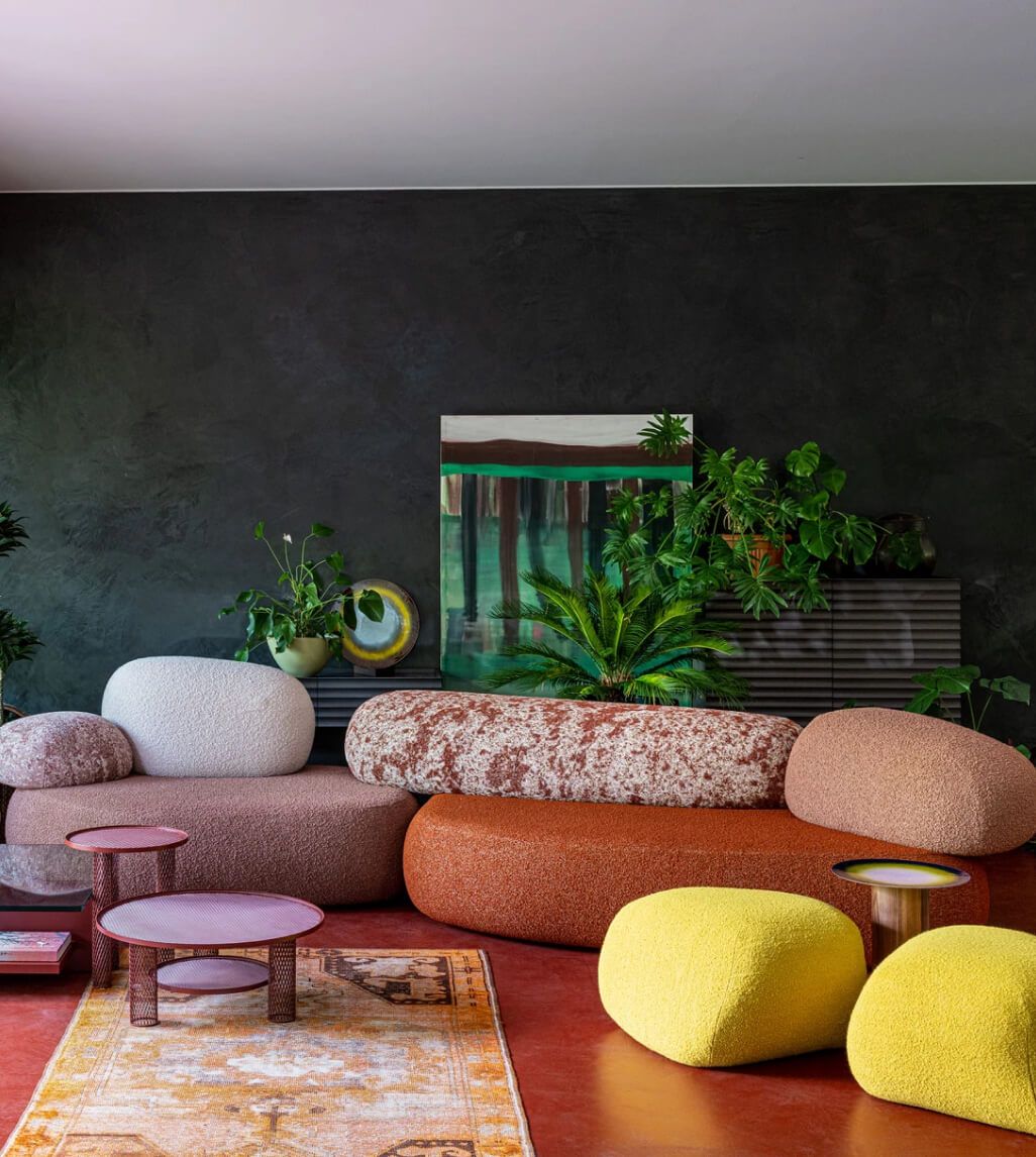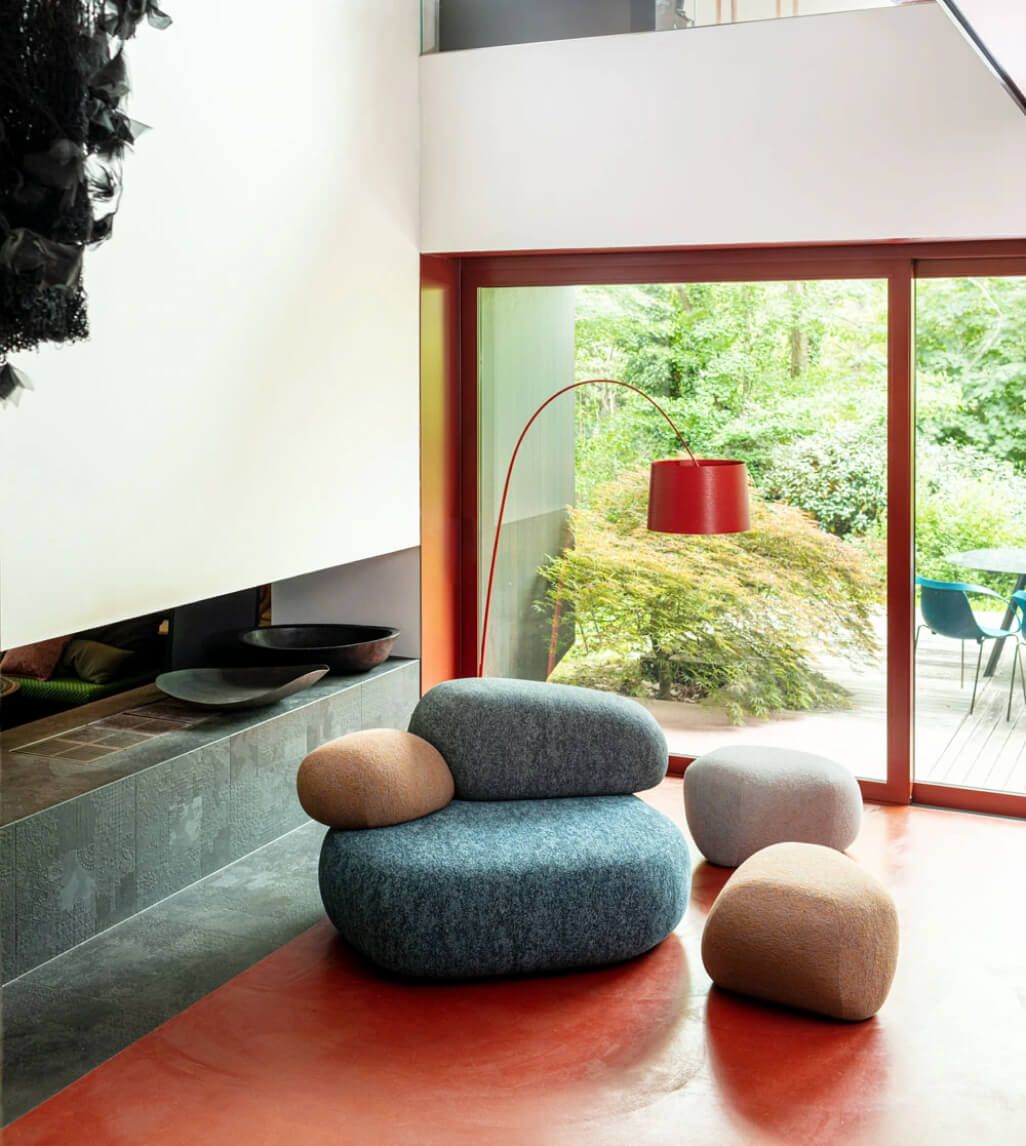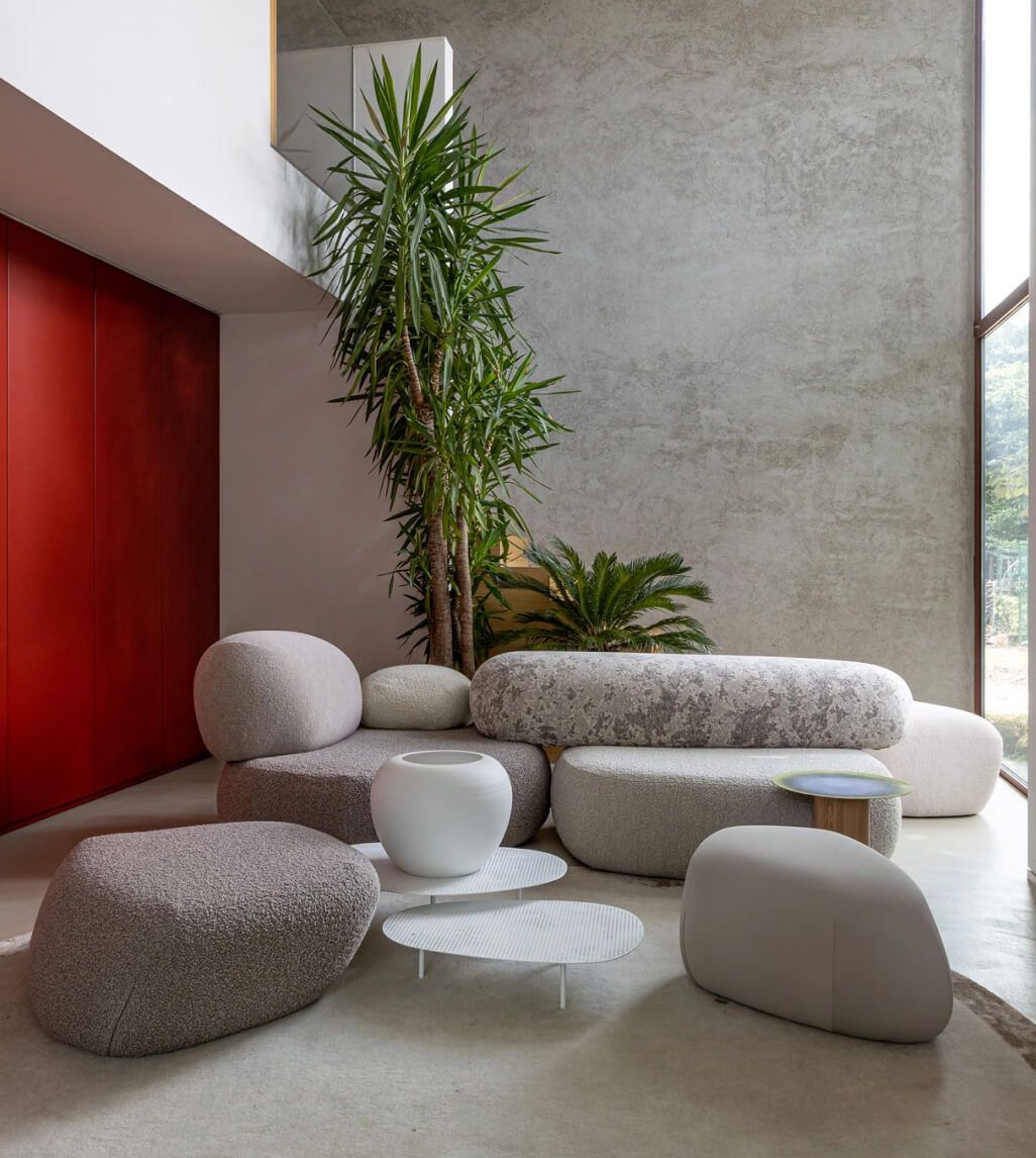 Благодаря модульной структуре, модульный диван Pebble Rubble предлагает безграничные возможности компоновки. 15 многофункциональных элементов и 3 пуфа позволяют создавать как уединенные уголки, так и масштабные композиции для общественных пространств — отелей, лобби, офисов. Диван Moroso этой коллекции не просто функционален — он рассказывает историю, соединяя природу и современный дизайн. Натуральные текстуры обивки, имитирующие мох или песчаник, усиливают эффект погружения в природную среду, даря ощущение гармонии и полного релакса.